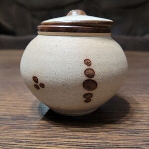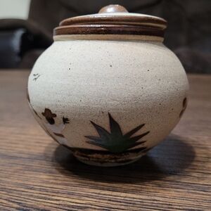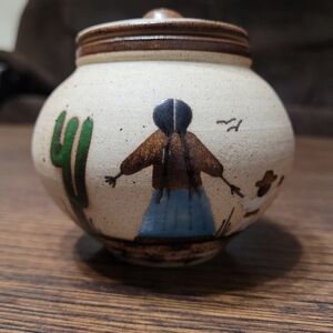 Folk art TONALA MEXICO vase featuring a mother and her child. It is the sandstone-style, so the texture is slightly grainy to the touch, except for the painted areas which are smooth. The interior of the vase is also glazed and smooth. The art is well done, as we can see the mother's braided hair, the cactus and yucca plant, and the small boy with a hat. The bottom of the vase is marked MEXICO. Comes with lid!!! everyone I see has no lid this has one.