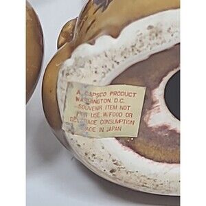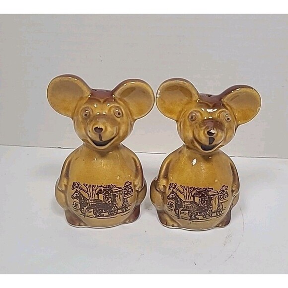 This product is a set of vintage salt and pepper shakers in the shape of mice with googly eyes, manufactured by Capsco in Japan during the 1950s. Made of ceramic in a brown color, this novelty set includes a pepper shaker and a salt shaker. The whimsical design and original production make it a unique collectible for kitchen and home decor enthusiasts. Bin 94