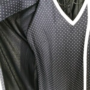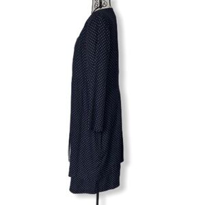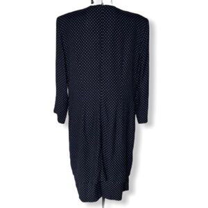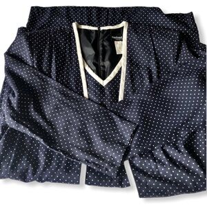 One piece dress designed to look like a jacket over a separate dress. V-neck. White polka dots on navy background. Edging on the V-neck and on the jacket lapels. Shoulder pads-easily removed. Lined in the top section/zipper in the back. 3/4 length sleeves. Made in Canada. Vintage size 14 but please refer to measurements to ensure proper fit.