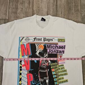 Vintage Michael Jordan MVP t-shirt, featuring a bold graphic print styled like a newspaper front page. This tee commemorates Jordan’s legendary status with a collage of classic dunks and MVP headlines in vibrant retro colors. Soft vintage feel, it’s a collectible piece for fans of 90s sportswear and streetwear alike. The XL fit and graphic-heavy design make it perfect for layering or wearing as a statement piece.