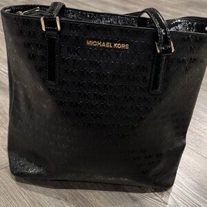 Stylish black tote with signature MK pattern. Shiny finish adds elegance. Ideal for daily use.