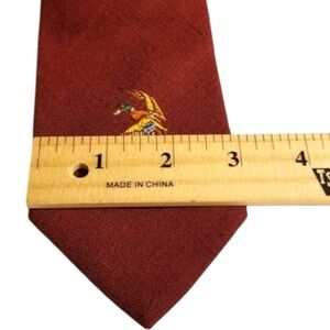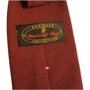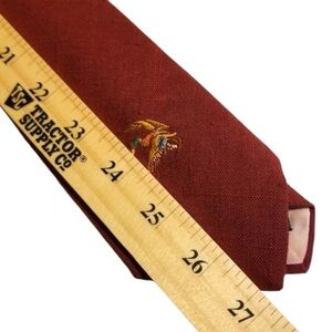 Michael Reed Vintage Woven Tie. Rust red, terracotta, cinnamon, or spice-toned often associated with styles from earlier decades like the 1940s. Bar-tac, Slip-string, & tipped. Embroidered Duck motif on the wider blade, adding a subtle woodsy element. Linen-polyester blend, giving a slightly coarse or hopsack feel. Classic, timeless, and versatile, suitable for various occasions, including formal events or pairing with tweed for a more autumnal or winter look.