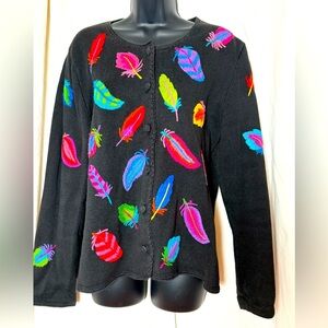 Vintage Michael Simon Embroidered Feathers Sweater Button Down Womens Sz M 1998