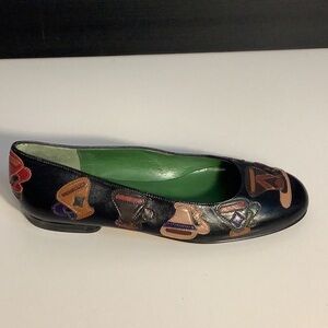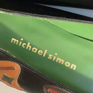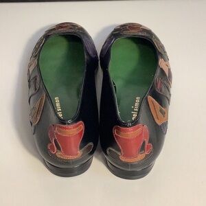 Some of you may know Michael Simon from his fun sweaters. Rare to find shoes. Made in Spain. Black leather with coffee cups in various colors. Approx heel height is 1/2 inch. They do look somewhat on the narrow side with width at widest part of sole 3.25 inches. Beautiful condition.