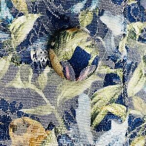 True vintage Michael Taylor women's floral blazer. Made of a beautiful jacquard fabric with shoulder pads, fabric covered buttons and faux pockets. Blazer sits past the waist. Dry clean only.