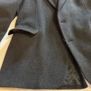 This is a vintage Michael/Sterns blazer jacket for men in size 42R. It is made of camel hair in a charcoal grey color. The jacket features a two-button closure and a tailored look, suitable for business occasions.