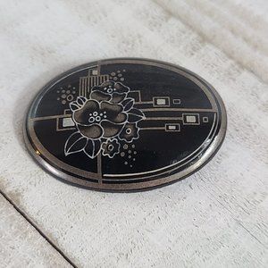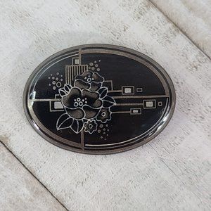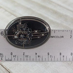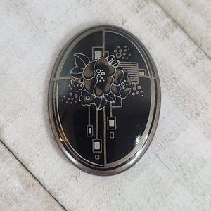 Vintage Michaela Frey Brooch Signed Oval Enamel Black Silver Floral Art Deco