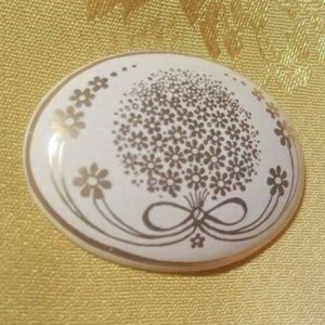 Vintage Michaela Frey Summer Floral Enamel Art Nouveau designed Pin Shades of White to Beige, with Gold Floral Arrangementit's Marked inside Michaela Frey. It is Oval 1.625 inch wide and 1 inch tall". It is in wonderful condition.