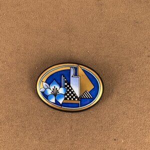 Michaela FREY WILLE Brooch Modern Deco Art Geometry with Flower Motif Brooch Enamel Pin Broach Excellent Vintage Condition. Signed Michaela Frey on Back. Measures 1-3/8 inch x 1 inch. Gold Blue Black vibrant Colors
