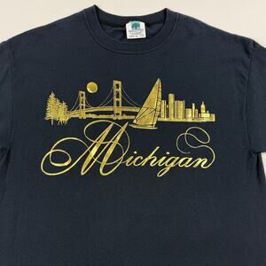 Vintage Michigan Mackinac Bridge Lake Sailboat Gold Embossed Striped Shirt XL