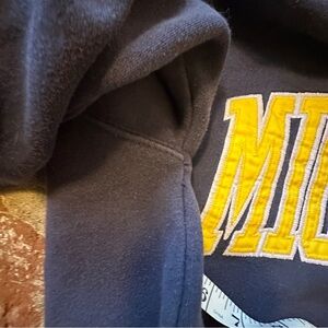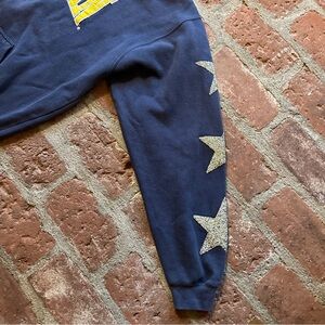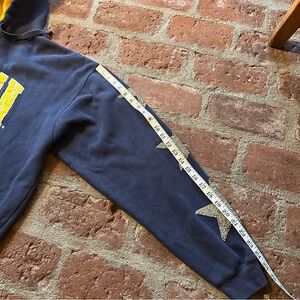 Vintage Michigan Men's Blue Oversized Hoodie Sweatshirt Stars Furst of a Kind. Vintage reworked hooded sweatshirt navy blue and yellow University of Michigan Wolverines. This is such a cool and unique piece. This vintage sweatshirt was reworked to add giant silver stars on each sleeve. See photos for approximate measurements. No size tag, fits like an oversized XL. Small hole inside under armpit on one side.
