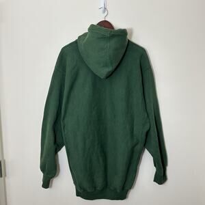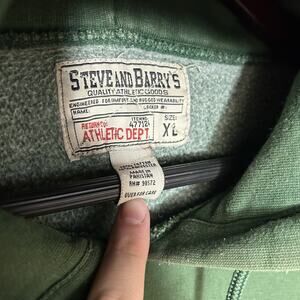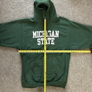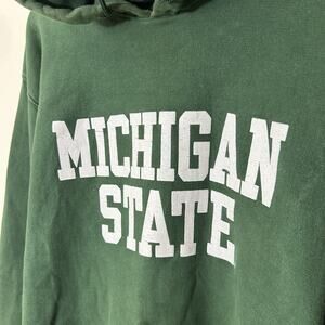 The product is a vintage Michigan State Spartans hoodie sweatshirt in size XL, designed for men. It is a heavyweight sweatshirt in green color, featuring the Steve & Barry's brand. This sweatshirt is perfect for football fans of the Michigan State Spartans looking for a nostalgic and comfortable piece of fan apparel.