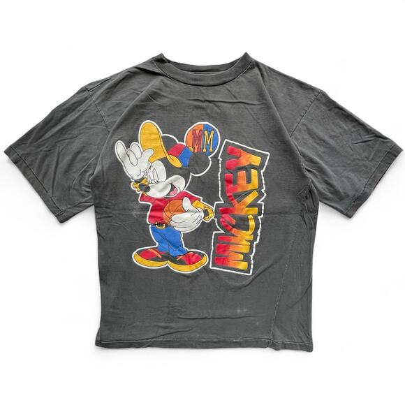 • Vintage Mickey Mouse Double-sided Basketball hooper t-shirt with bold primary colors on a super faded black tee, now dark gray. Cool reverse, mirror graphic front to back with single stitch sleeves and bottom hem. Classic 90s, Mickie Mouse, Disney nostalgia, cartoon, cute, hip hop, basketball, hooper, faded vibes.