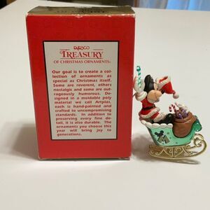 Mickey Mouse Vintage Christmas Ornament by Enesco. New in Box! Never used! Enesco Treasury “Gifts From Mickey”. Mickey dressed as Santa on a sleigh with gifts, candycanes and a bunny! #christmas #vintagedisney #mickeymouse