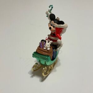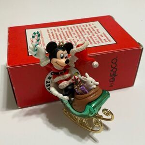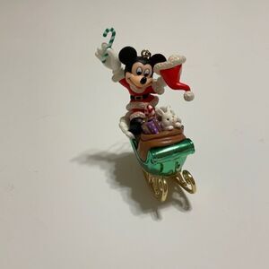 Mickey Mouse Vintage Christmas Ornament by Enesco. New in Box! Never used! Enesco Treasury “Gifts From Mickey”. Mickey dressed as Santa on a sleigh with gifts, candycanes and a bunny! #christmas #vintagedisney #mickeymouse