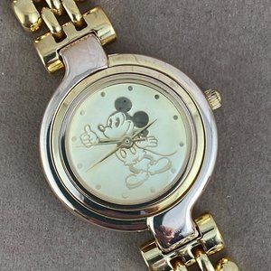 Vintage Mickey Mouse Thumbs Up Gold Tone Watch Exclusive for Disney Time 1 inch Case, Perfect Mineral Crystal, Gold Hands, Numbers and Markers Water-Resistant to 30 Meters Stunning 7 Inch Gold Tone Link Bracelet with Tan and Black 8 inch Leather Straps and Runs New Battery Ships with a spare Serviced Cleaned and Sanitized with Box