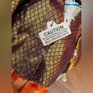 It is a plush but has plastic face and feet with molded sandals. The inside of its ears are satin