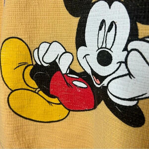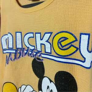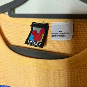 Yellow vintage Mickey Mouse sweatshirt from Mickey Unlimited. Size M/L. 100% cotton. Some cracking in the iron on lettering and character.