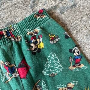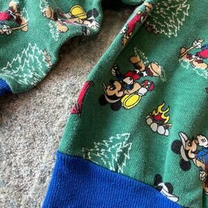 Vintage Disney Mickey's Stuff for Kids Green Camping Sweatsuit. Toddler boy size 3T. USA made. Cozy crewneck green pullover with blue cuffs and fun print featuring Mickey Mouse hiking, trees, tents, and campfires. Matching sweatpants. Elastic in pants waist is worn out, but no stains, tears, or other major flaws noted. Perfect for fall and winter!