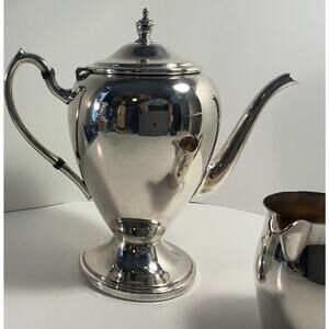 This vintage teapot set from Academy features a sleek mid-century modern design, with a silver on copper composition that exudes timeless elegance. The set includes a teapot and a creamer that showcase the brand's attention to detail. The teapot set is perfect for collectors of antique silver items looking to add a touch of sophistication to their collection.