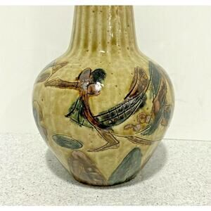 Vintage Mid Century Modern Art Pottery Vase - Made in Japan - looks like Okinawan Pottery. A tall vase with a slim neck - shiny drip glaze - incised mod abstract design that includes birds and other figures in a Brutalist inspired motif. Neck has a ribbed texture. Stoneware base - cannot see a hallmark or signature but the original label indicates MOC Japan. This looks like a well-made art piece. In excellent vintage condition - minor shelf wear includes a shallow chip on the base (see pic) - no significant damage or flaws. Fantastic decorative piece for your mid century home.