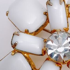 Features: Floral motif; milk glass stones; prong-set center rhinestone; dimensional design