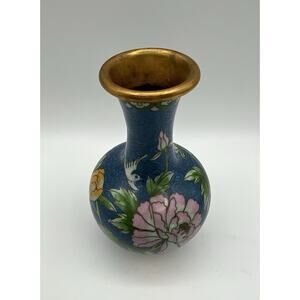 Vintage Mid Century Chinese Cloisonné 6” Vase Blue w Bird and Flowers