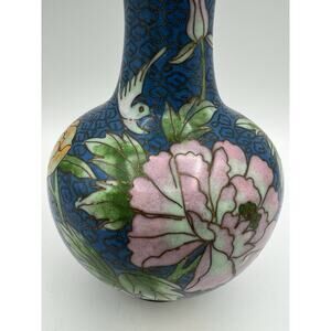 Beautiful Vintage Mid Century Chinese Cloisonné Vase Blue w Bird and Flowers. Vase measures approx. 6” tall. Overall good condition, there is a bruise on the side (see photos) where it got hit.
