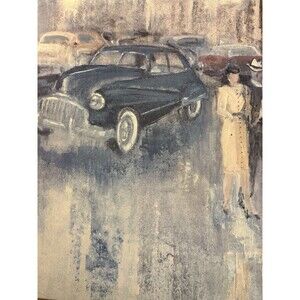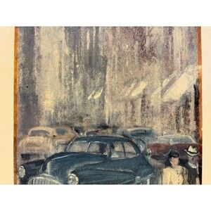 Step back in time with this moody, cinematic cityscape painting signed Lerado in the lower left corner. The piece features a bustling urban street scene with towering skyline architecture, vintage 1940s50s style cars, and two sharply dressed figures on the sidewalk all rendered in soft, expressive brushwork and a classic muted palette.