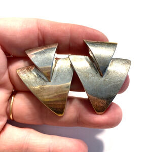 Vintage Mid Century Clip On Earring - Chunky 1980's Silvertone Geometric Shapes - these look like Artisan made - mod dimensional triangle shapes. No hallmarks - nice quality fashion jewelry - unique and eye-catching. In good vintage condition - there appears to be darkening like tarnish on these but it doesn't easily polish off - a highly stylized look - no damage or flaws - these are nice!