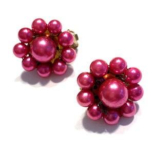 Vintage Mid Century Clip On Earrings done in a gorgeous shiny fuschia pink color - a large center bead surrounded by a smaller cluster of same color beads all wired to the gold tone setting. Hallmarked Japan on the clips - these are a brilliant pop of color perfect to brighten up any outfit. In overall good vintage condition - the beads look great - the goldtone metal backing has heavy loss of the finish. Still very wearable and so pretty!