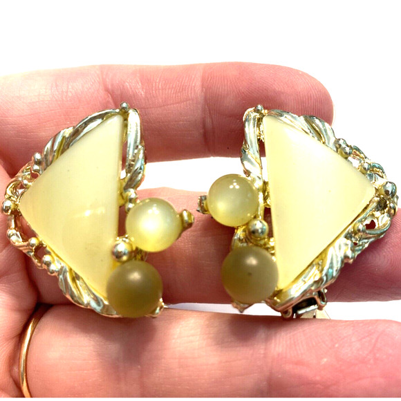 Vintage Mid Century Clip On Earrings Gold Green Lemon Lime Moonglow Thermoset
