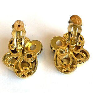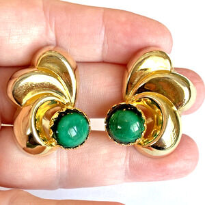 Vintage Mid Century Clip On Earrings - dramatic goldtone metal settings with a single polished green stone in the design. Hollowed with a filigree style backing these earrings are lightweight despite their statement jewelry size and shape - very easy to wear - very eye-catching. No hallmarks but nice quality fashion jewelry. These are in excellent vintage condition - light overall surface wear - no damage or flaws - just stunning!