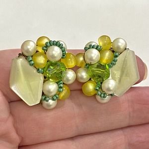 Vintage Mid Century Clip On Earrings Pearl Yellow Chartreuse Green Bead Clusters