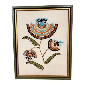 Vintage Mid Century Crewel Embroidery Art Framed Abstract Flowers 17x13.5