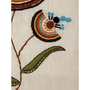 Add a bold retro flair to your gallery wall with this striking vintage crewel embroidery art piece. Hand-stitched in vivid shades of orange, turquoise, brown, and navy on an off-white background, this mid-century design features abstract florals with radiating geometric patterns and textured stems and leaves.