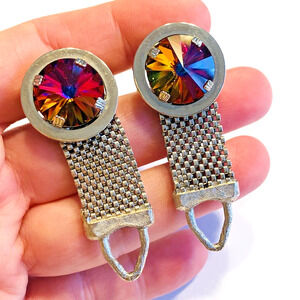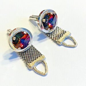 Vintage Mid Century Cufflinks done in chunky silvertone metal mesh wrap with a single watermelon colors glass rhinestone at the center. These cufflinks are a must-have addition to your cufflinks collection. Stunning green & pink colors in the stones, fantastic sparkle, classic design - statement jewelry for men! No hallmarks on this pair but the quality is very good and these look amazing. In excellent vintage condition - minor surface wear - no damage or flaws - nice enough to give as a gift!