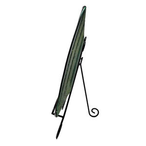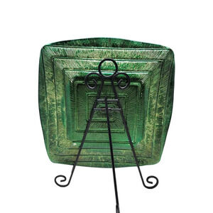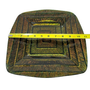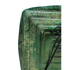 Square with maze or spiral like design. The back of the plate is coated with a green and gold metallic paint. Depending on the lighting it can look more green or gold.