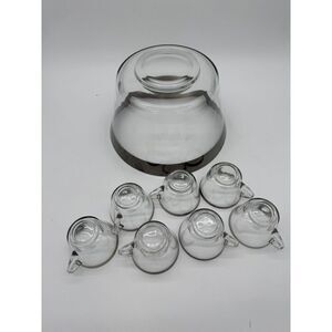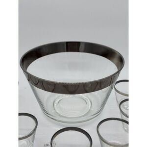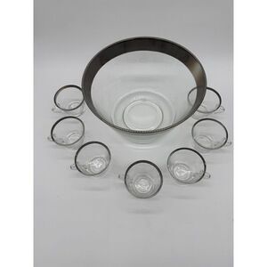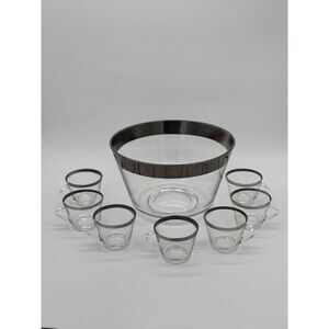 Vintage Mid Century Dorothy Thorpe Silver Band Punch Bowl and 7 Cups