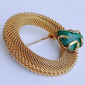 A bold mid-century design with a sculptural gold-tone mesh and a rich green aventurine stone, this brooch blends retro elegance with organic texture—ideal for collectors who appreciate distinctive materials and period craftsmanship.