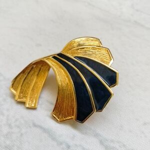 Vintage Mid Century Geometric Gold Tone Scarf Ring Navy Enamel Retro 90s