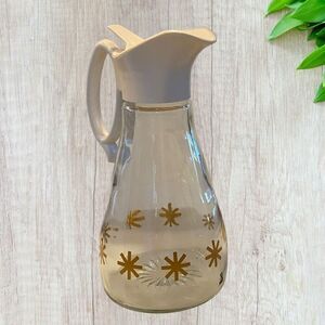 Glass syrup dispenser from the 1960’s era. Excellent condition! Gold starburst perfect addition for your MCM kitchen. 7.5” tall.