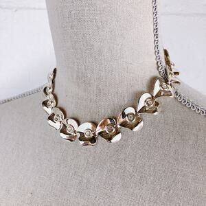 A fluid row of sculpted gold tone hearts, each centered with a clear rhinestone, makes this necklace a bold yet elegant statement from the mid-century era. The dimensional design catches the light beautifully, giving it both presence and polish.
