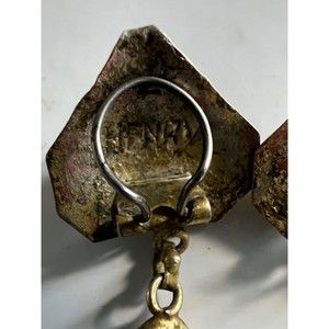 Vintage Mid Century French Jewelry designer Henry Perichon signed clip-on dangling Earrings. Gilded bronze metal in a Baroque design influence with faux turquoise , signed 'Henry' at the back. Good vintage condition. There is some ware to the gold gilded brass on the back of the earrings. Dimensions: 62 mm long x 21 mm widest