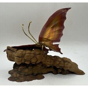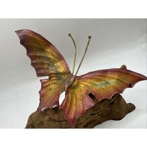 Vintage Mid Century Metal Butterfly Sculpture Tree Root Wood Base Rustic decor 7x5.5