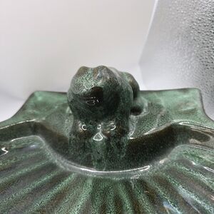 This vintage Mid-Century Modern art pottery piece is a large scalloped dish in a beautiful green color. The unique design features a perching frog on top of a shell-shaped form, measuring 12 x 12 inches. Handmade from clay using pottery techniques, this glossy finish piece exudes a retro charm that would make a stylish addition to any decor. The unmarked brand adds to its allure as a one-of-a-kind vintage find for collectors of decorative pottery and glassware.