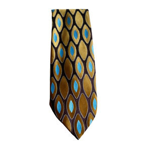 This tie walked straight out of the 1950s! It's very Mid Century Modern in style. The necktie comes from Monsieur Cravatieur and is Trevira, which is a type of "non-stain, fire-resistant" polyester that became popular during this time frame. The tie is chocolate brown with olive-tan ovals with light blue ovals inside of those. Very versatile for a brown or tan suit or blazer. No flaws to note. Cleaned and stored in a smoke free home.