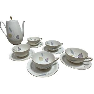 The set includes a teapot, creamer, sugar bowl, and 5 cups and saucers, all adorned with a pattern of stylized leaves in shades of green, yellow, and purple with gold trim. This design is characteristic of mid-century modern aesthetics.