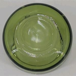 This vintage mid-century modern green glass ashtray is a stylish addition to any collection. With a round shape and a diameter of 3.75 inches, it provides ample space for cigarette ashes. Made of pressed glass with a retro design, this ashtray is a unique piece from the United States, perfect for adding a touch of nostalgia to any decor.