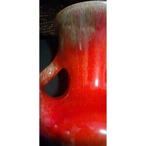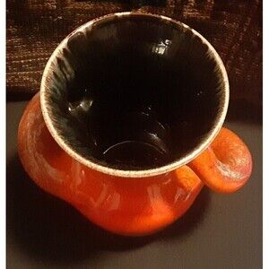 This is an absolutely stunning Mid Century Modern ceramic vase that can light up your room and your conversations. The orange glaze has a tremendous depth that makes it seem to glow, and that gives the impression of glass-like translucence. The lower curve is an iridescent black that blends upward into the orange, giving a lava-like look. The upper rim and handles have an additional smoky yellow-tan speckling that lays smoothly within the orange in a marrow pattern, giving the impression of a rough texture inside of the glassy orange.